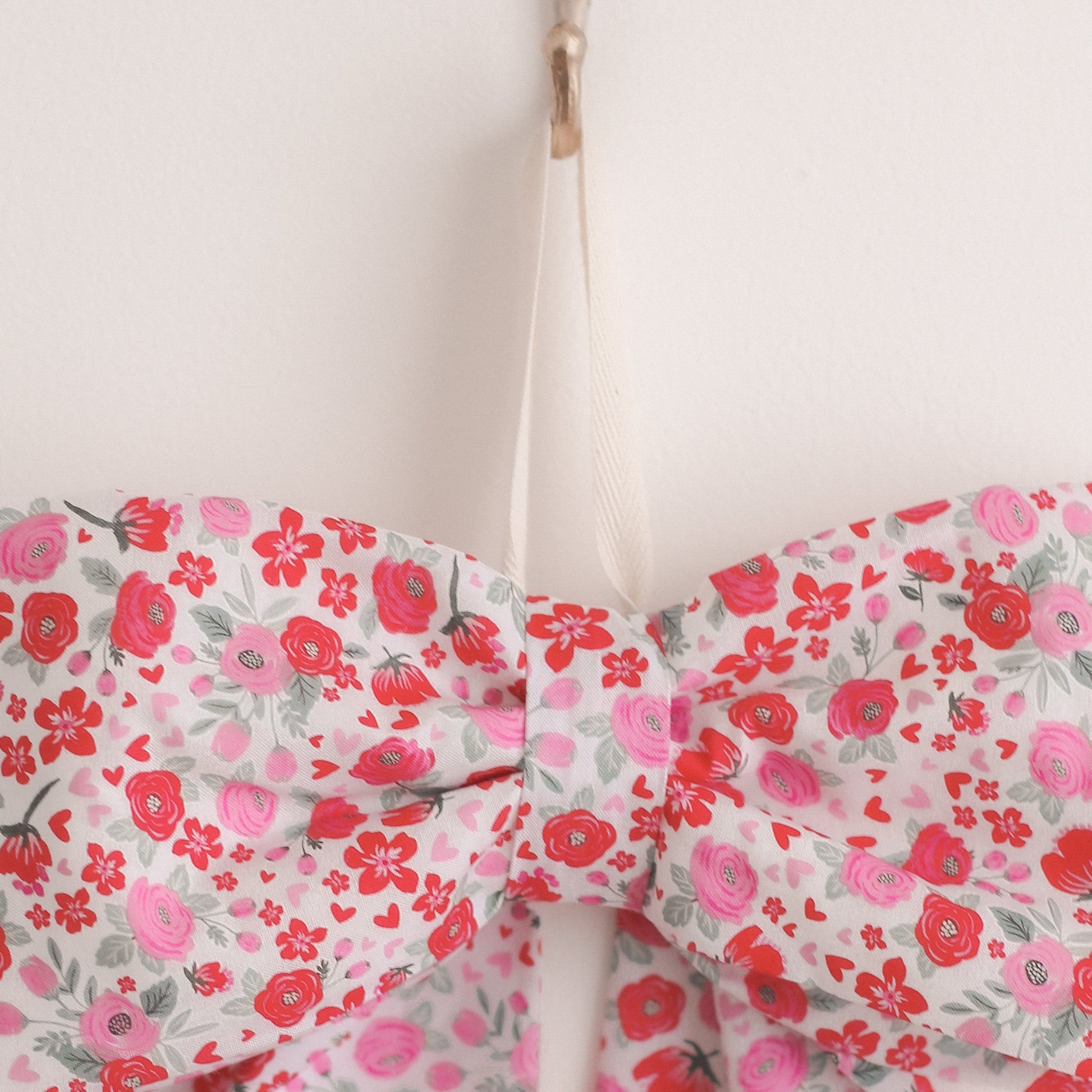 This Rose Garden Bow is handcrafted from soft cotton fabric featuring a delicate mix of red and blush florals with subtle heart details. Romantic without feeling overdone, it adds a gentle, heirloom touch to seasonal and everyday décor.
